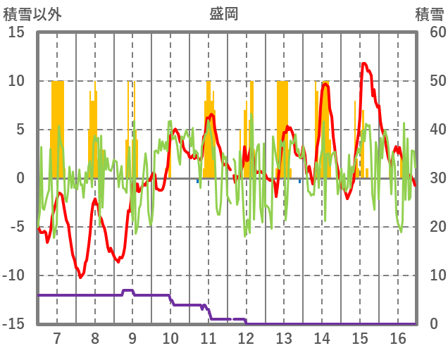 | 日 | 時 | 気温 | 降水 | 風向/風速 | 日照 | 積雪 | 降雪 |