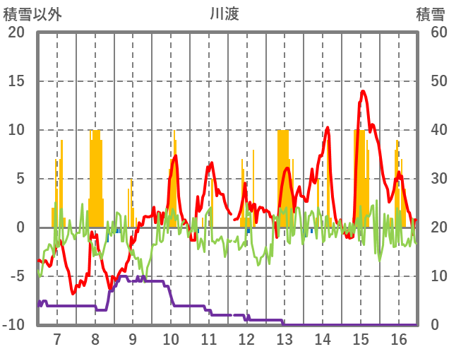 | 日 | 時 | 気温 | 降水 | 風向/風速 | 日照 | 積雪 | 降雪 |