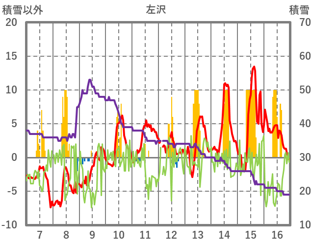 | 日 | 時 | 気温 | 降水 | 風向/風速 | 日照 | 積雪 | 降雪 |