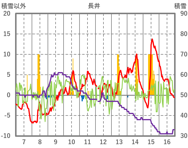 | 日 | 時 | 気温 | 降水 | 風向/風速 | 日照 | 積雪 | 降雪 |
