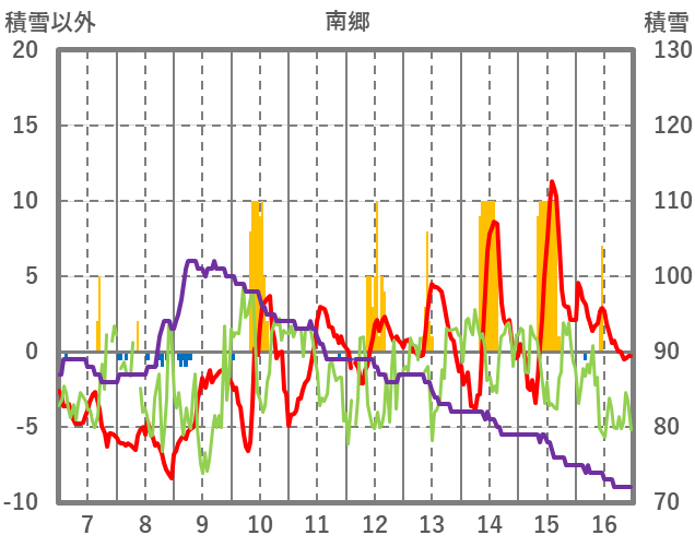 | 日 | 時 | 気温 | 降水 | 風向/風速 | 日照 | 積雪 | 降雪 |