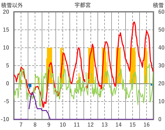 | 日 | 時 | 気温 | 降水 | 風向/風速 | 日照 | 積雪 | 降雪 |