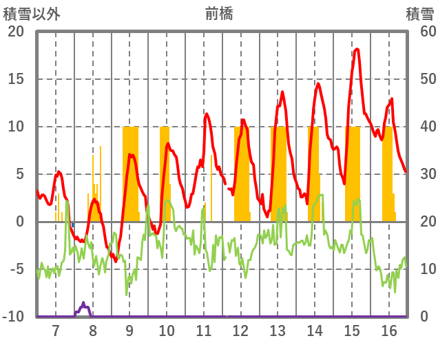 | 日 | 時 | 気温 | 降水 | 風向/風速 | 日照 | 積雪 | 降雪 |