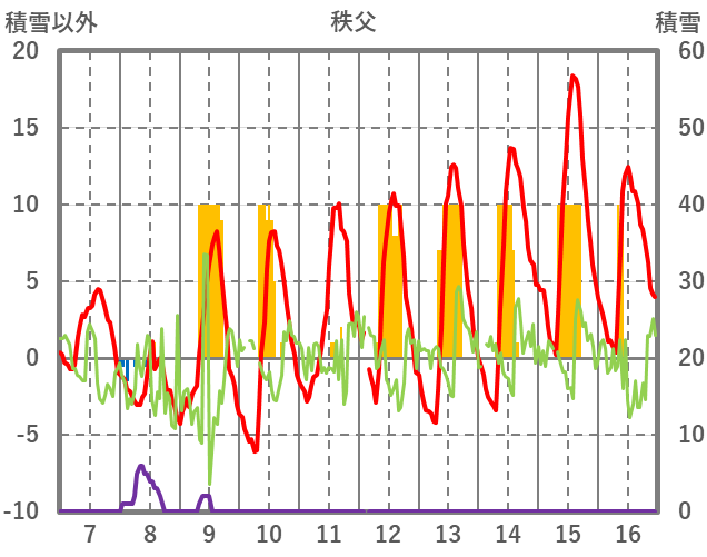| 日 | 時 | 気温 | 降水 | 風向/風速 | 日照 | 積雪 | 降雪 |