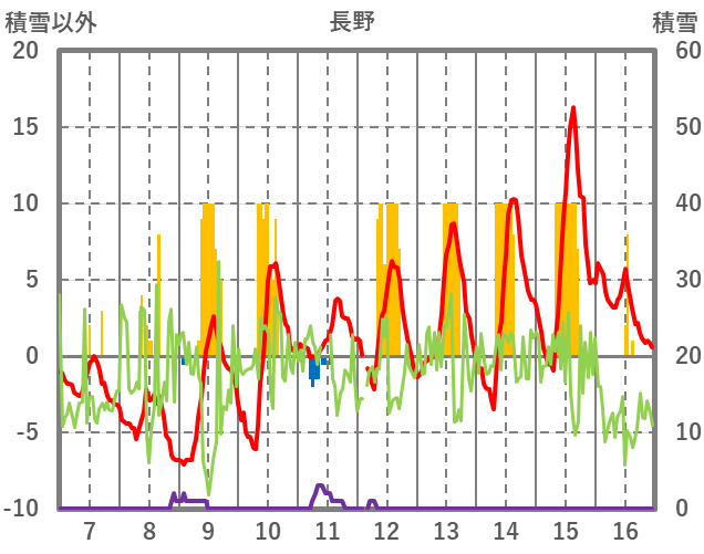 | 日 | 時 | 気温 | 降水 | 風向/風速 | 日照 | 積雪 | 降雪 |
