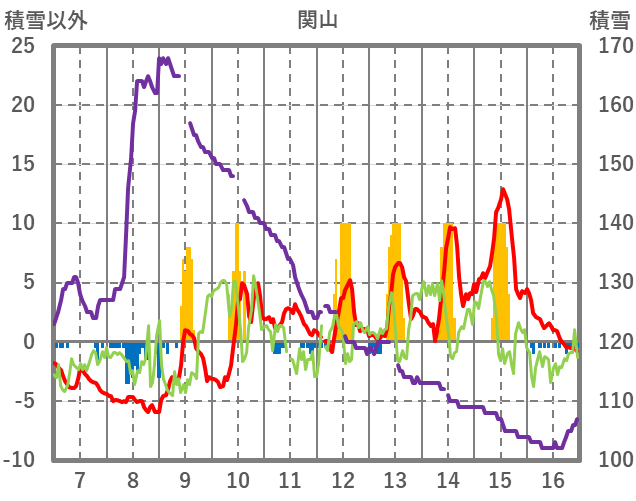 | 日 | 時 | 気温 | 降水 | 風向/風速 | 日照 | 積雪 | 降雪 |