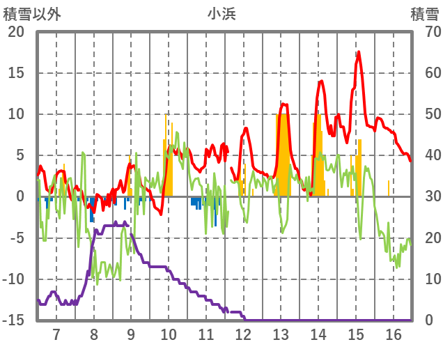 | 日 | 時 | 気温 | 降水 | 風向/風速 | 日照 | 積雪 | 降雪 |