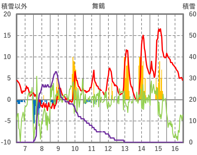 | 日 | 時 | 気温 | 降水 | 風向/風速 | 日照 | 積雪 | 降雪 |