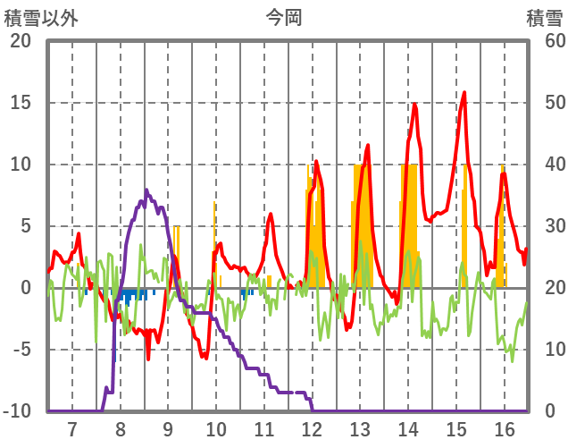 | 日 | 時 | 気温 | 降水 | 風向/風速 | 日照 | 積雪 | 降雪 |