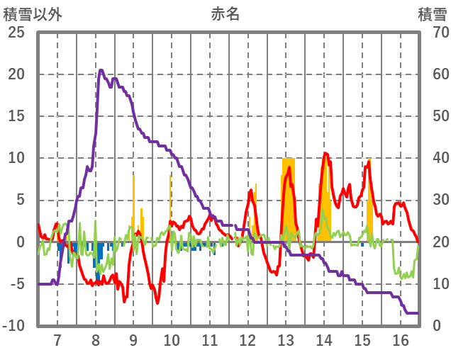 | 日 | 時 | 気温 | 降水 | 風向/風速 | 日照 | 積雪 | 降雪 |