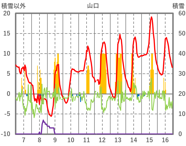| 日 | 時 | 気温 | 降水 | 風向/風速 | 日照 | 積雪 | 降雪 |