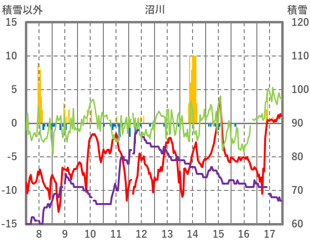 | 日 | 時 | 気温 | 降水 | 風向/風速 | 日照 | 積雪 | 降雪 |