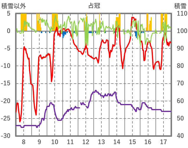 | 日 | 時 | 気温 | 降水 | 風向/風速 | 日照 | 積雪 | 降雪 |