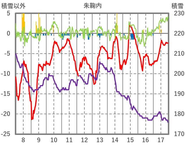 | 日 | 時 | 気温 | 降水 | 風向/風速 | 日照 | 積雪 | 降雪 |