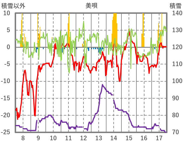 | 日 | 時 | 気温 | 降水 | 風向/風速 | 日照 | 積雪 | 降雪 |