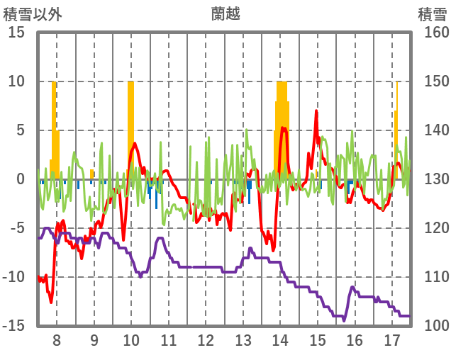 | 日 | 時 | 気温 | 降水 | 風向/風速 | 日照 | 積雪 | 降雪 |
