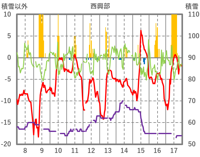 | 日 | 時 | 気温 | 降水 | 風向/風速 | 日照 | 積雪 | 降雪 |