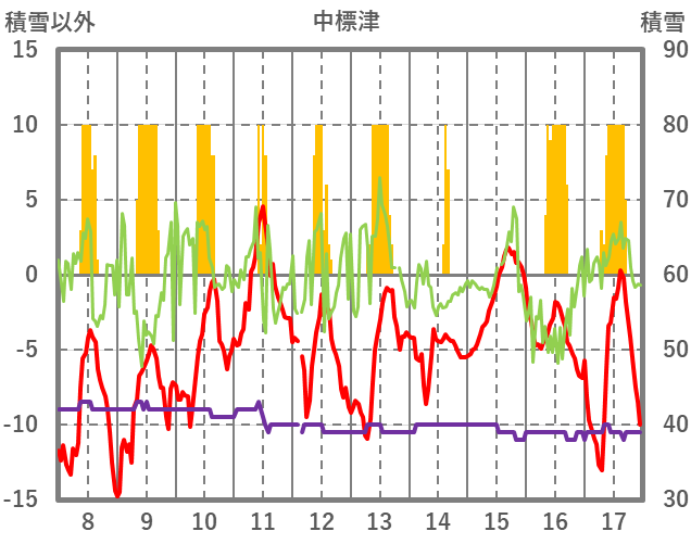 | 日 | 時 | 気温 | 降水 | 風向/風速 | 日照 | 積雪 | 降雪 |