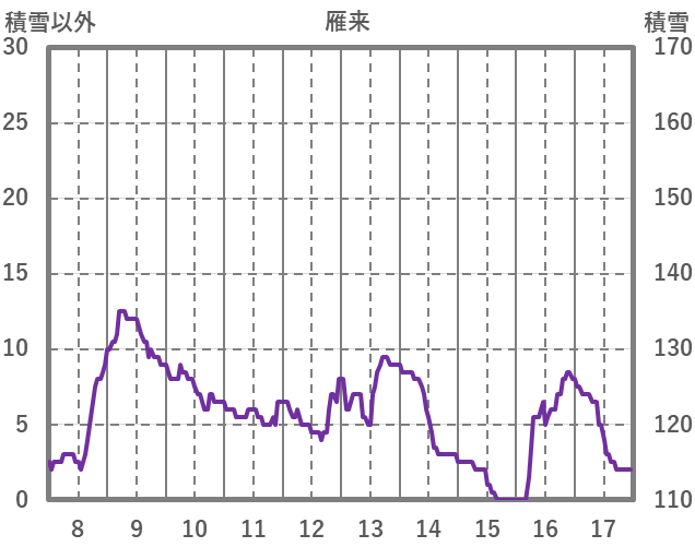 | 日 | 時 | 気温 | 降水 | 風向/風速 | 日照 | 積雪 | 降雪 |