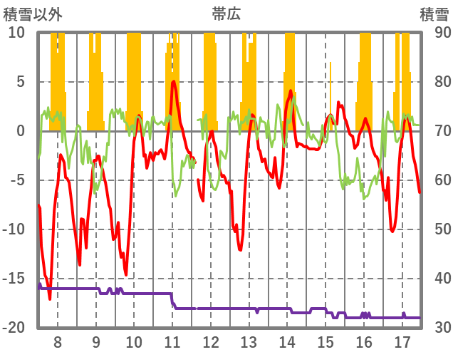 | 日 | 時 | 気温 | 降水 | 風向/風速 | 日照 | 積雪 | 降雪 |
