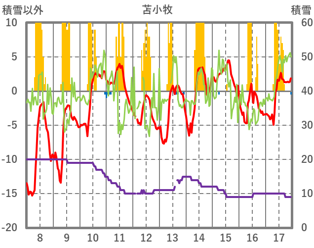 | 日 | 時 | 気温 | 降水 | 風向/風速 | 日照 | 積雪 | 降雪 |