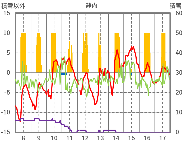 | 日 | 時 | 気温 | 降水 | 風向/風速 | 日照 | 積雪 | 降雪 |