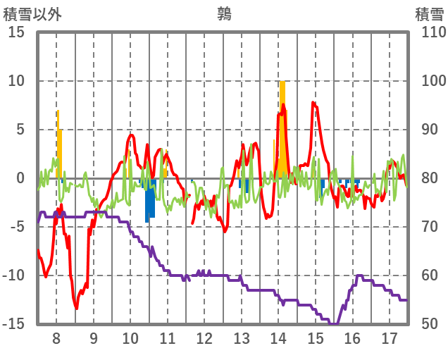 | 日 | 時 | 気温 | 降水 | 風向/風速 | 日照 | 積雪 | 降雪 |