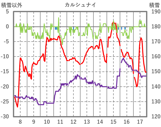 | 日 | 時 | 気温 | 降水 | 風向/風速 | 日照 | 積雪 | 降雪 |