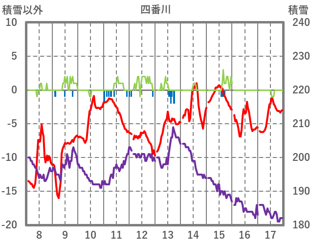 | 日 | 時 | 気温 | 降水 | 風向/風速 | 日照 | 積雪 | 降雪 |