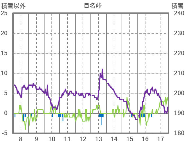 | 日 | 時 | 気温 | 降水 | 風向/風速 | 日照 | 積雪 | 降雪 |