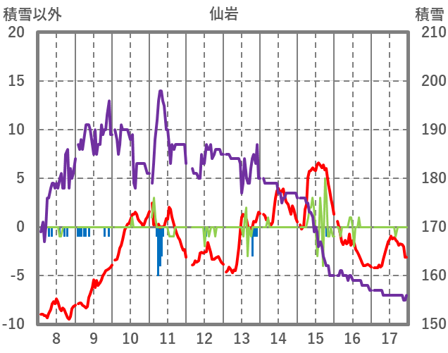 | 日 | 時 | 気温 | 降水 | 風向/風速 | 日照 | 積雪 | 降雪 |