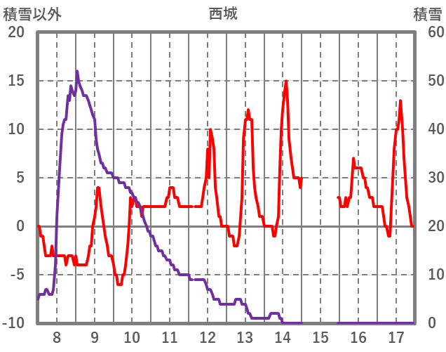| 日 | 時 | 気温 | 降水 | 風向/風速 | 日照 | 積雪 | 降雪 |