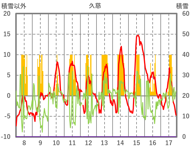 | 日 | 時 | 気温 | 降水 | 風向/風速 | 日照 | 積雪 | 降雪 |