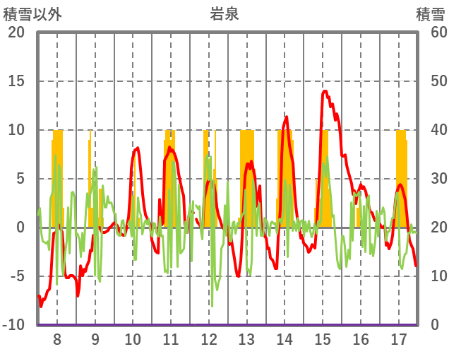 | 日 | 時 | 気温 | 降水 | 風向/風速 | 日照 | 積雪 | 降雪 |