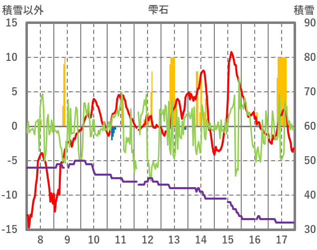 | 日 | 時 | 気温 | 降水 | 風向/風速 | 日照 | 積雪 | 降雪 |