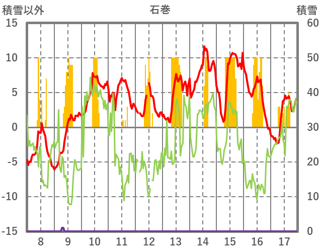 | 日 | 時 | 気温 | 降水 | 風向/風速 | 日照 | 積雪 | 降雪 |