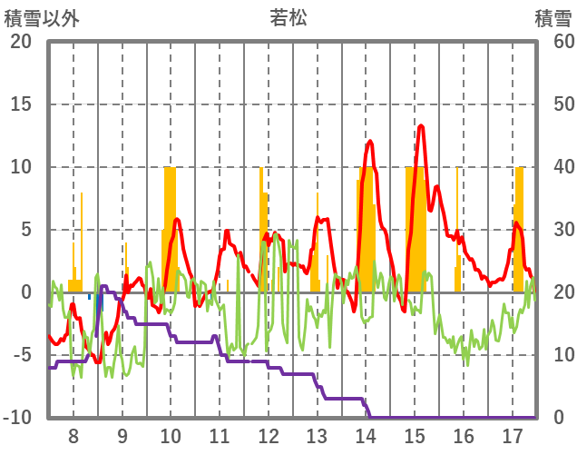 | 日 | 時 | 気温 | 降水 | 風向/風速 | 日照 | 積雪 | 降雪 |