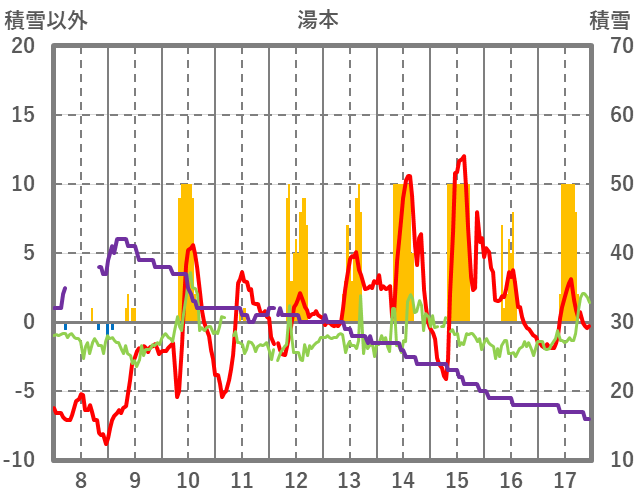 | 日 | 時 | 気温 | 降水 | 風向/風速 | 日照 | 積雪 | 降雪 |