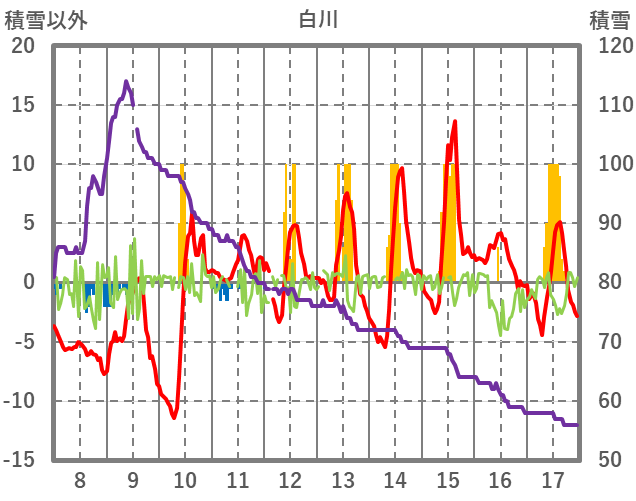 | 日 | 時 | 気温 | 降水 | 風向/風速 | 日照 | 積雪 | 降雪 |