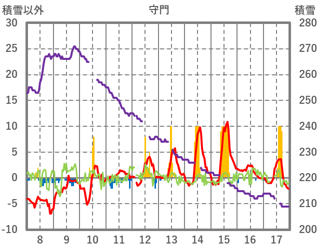 | 日 | 時 | 気温 | 降水 | 風向/風速 | 日照 | 積雪 | 降雪 |