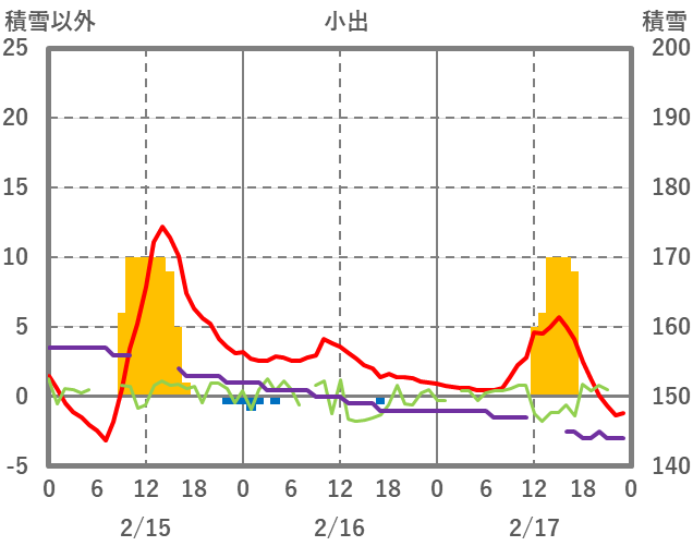 | 日 | 時 | 気温 | 降水 | 風向/風速 | 日照 | 積雪 | 降雪 |