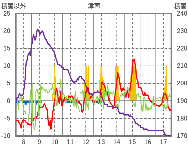 | 日 | 時 | 気温 | 降水 | 風向/風速 | 日照 | 積雪 | 降雪 |