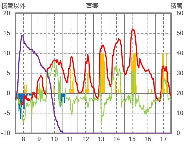 | 日 | 時 | 気温 | 降水 | 風向/風速 | 日照 | 積雪 | 降雪 |