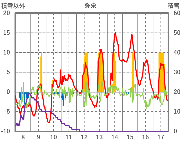 | 日 | 時 | 気温 | 降水 | 風向/風速 | 日照 | 積雪 | 降雪 |