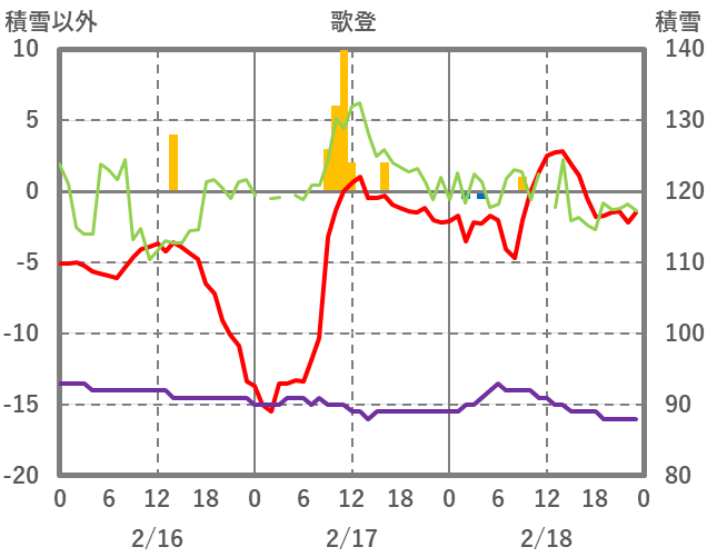 | 日 | 時 | 気温 | 降水 | 風向/風速 | 日照 | 積雪 | 降雪 |