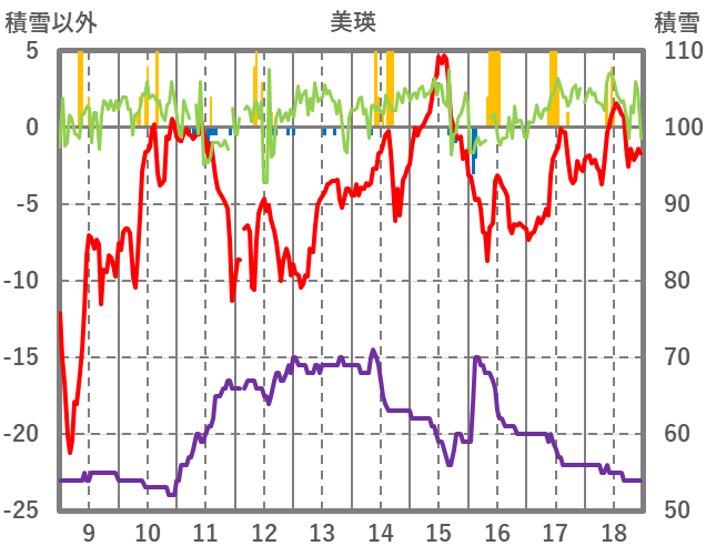 | 日 | 時 | 気温 | 降水 | 風向/風速 | 日照 | 積雪 | 降雪 |