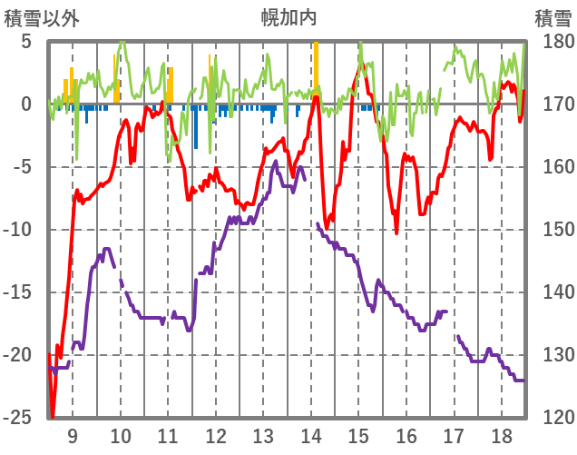 | 日 | 時 | 気温 | 降水 | 風向/風速 | 日照 | 積雪 | 降雪 |