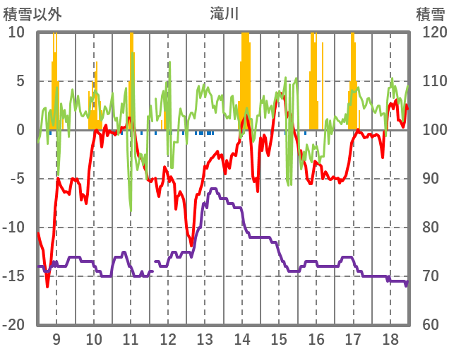 | 日 | 時 | 気温 | 降水 | 風向/風速 | 日照 | 積雪 | 降雪 |