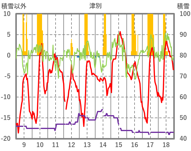 | 日 | 時 | 気温 | 降水 | 風向/風速 | 日照 | 積雪 | 降雪 |