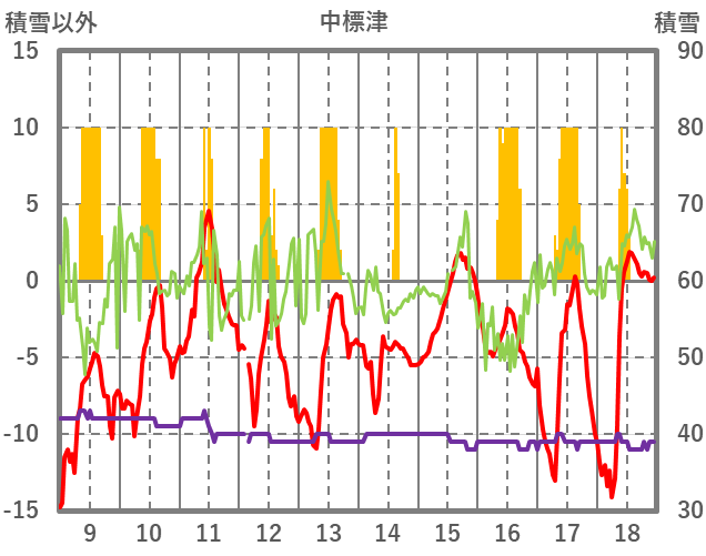 | 日 | 時 | 気温 | 降水 | 風向/風速 | 日照 | 積雪 | 降雪 |